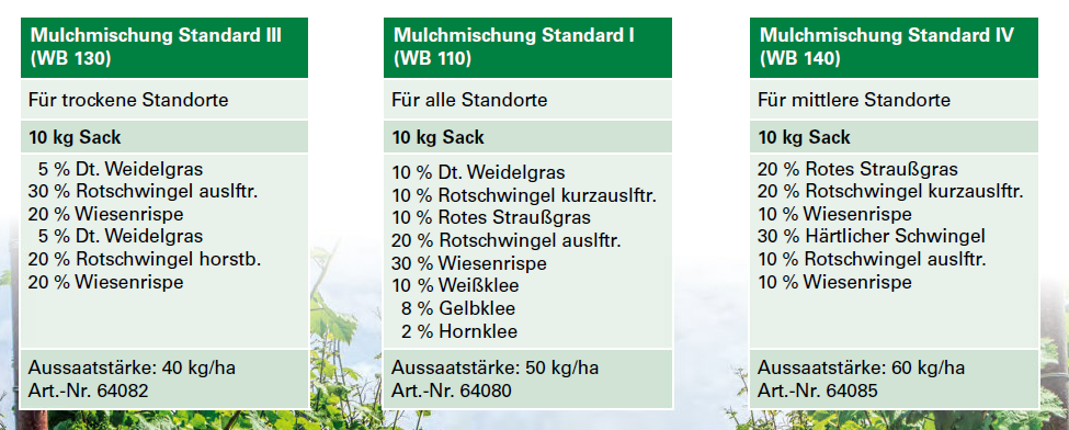 Die Mischung ist an die besonders trockenen Lagen angepasst. Luzerne wurzelt tief und kann zur Wasserkonkurrenz gegenüber der Rebe auftreten.