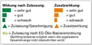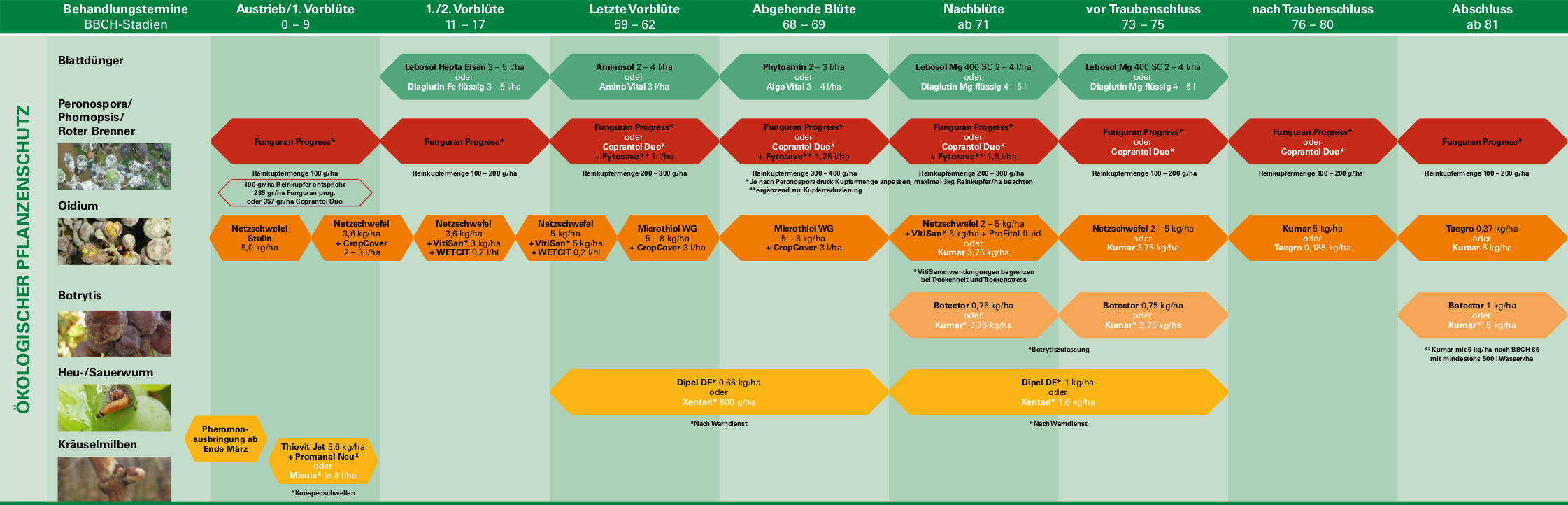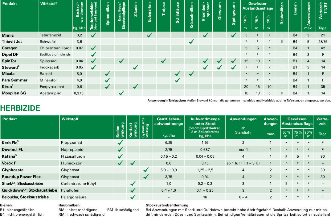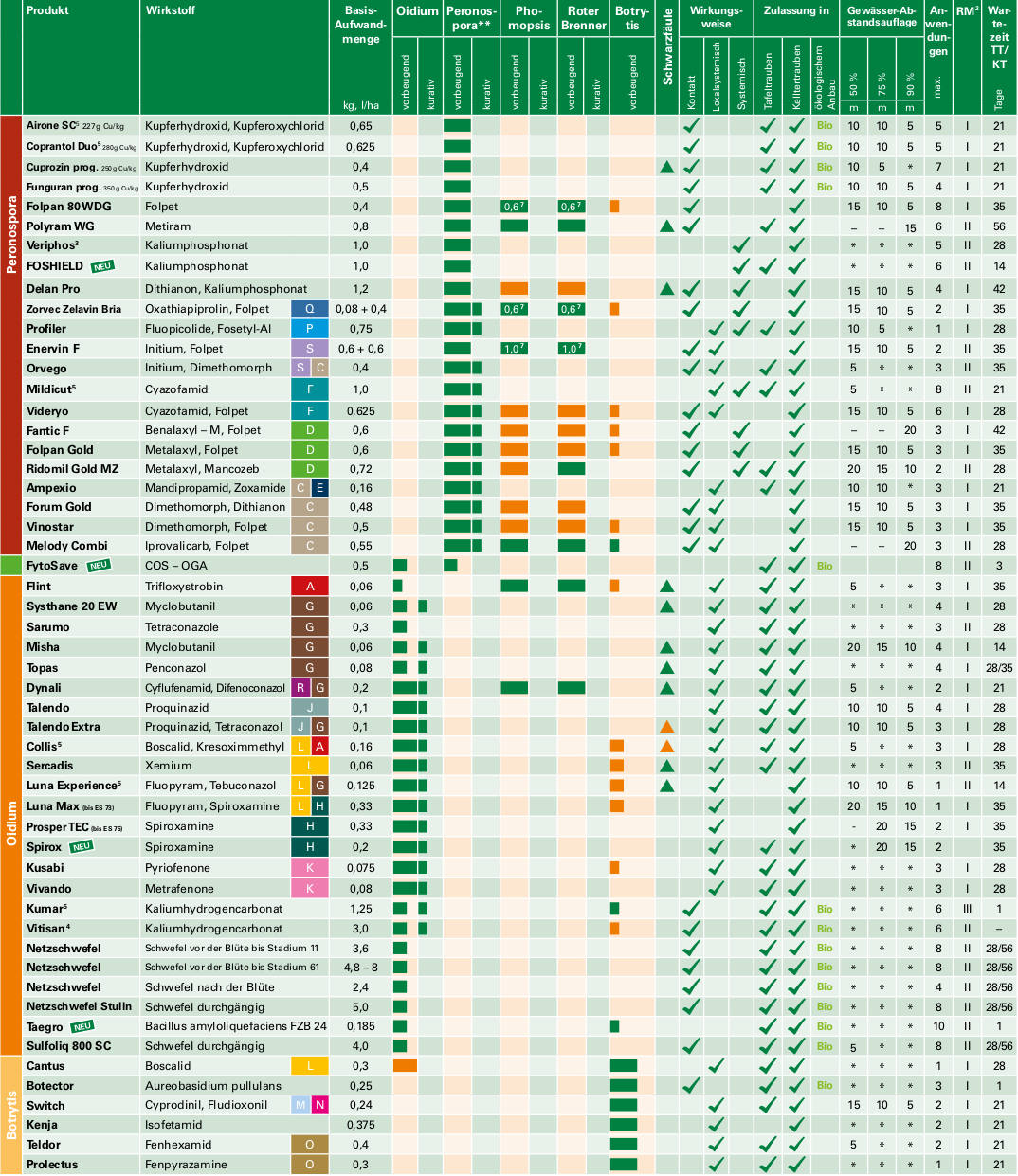 **Die kurative Wirkung eines Produktes gegen Peronospora kann sich unter günstigen Bedingungen für den Erreger bis auf 24 Std. nach einer Infektion reduzieren. Da die Kurativleistung ohnehin nur auf den Blättern zu erwarten ist, sollte immer eine vorbeugende Bekämpfung erfolgen.1) Zulassung wird erwartet. 2) Raubmilben: RM I: nicht schädigend, RM II: schwach schädigend, RM III: schädigend ³) Veriphos und Frutogard nur in Verbindung mit einem Kontaktmittel einsetzen 4) unbedingt mit einem Netzmittel einsetzen, lassen Sie sich vor Ort beraten! 5) Aktuelle Zulassungssituation beachten 6) Sorteneinschränkung 7) für diese Indikation zugelassene Basisaufwandmenge des Folpet-Produktes, TT = Tafeltrauben, KT = Keltertrauben
